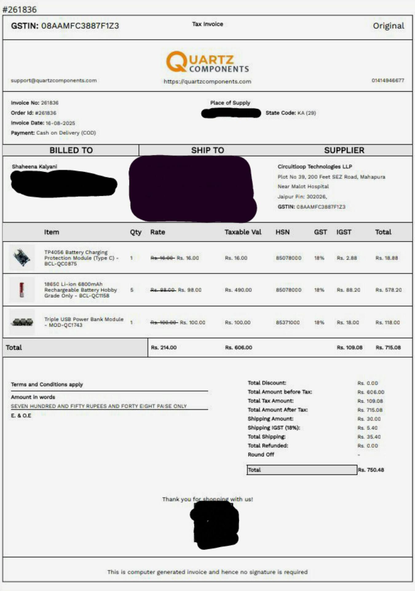We ship to all over India with free shipping on all prepaid orders above 500. For Cash on Delivery orders INR 80 will be charged for orders below INR 599 and INR 30 will be charged for the orders above 599. Please contact to our support team at support@quartzcomponents.com for any question related to shipping.