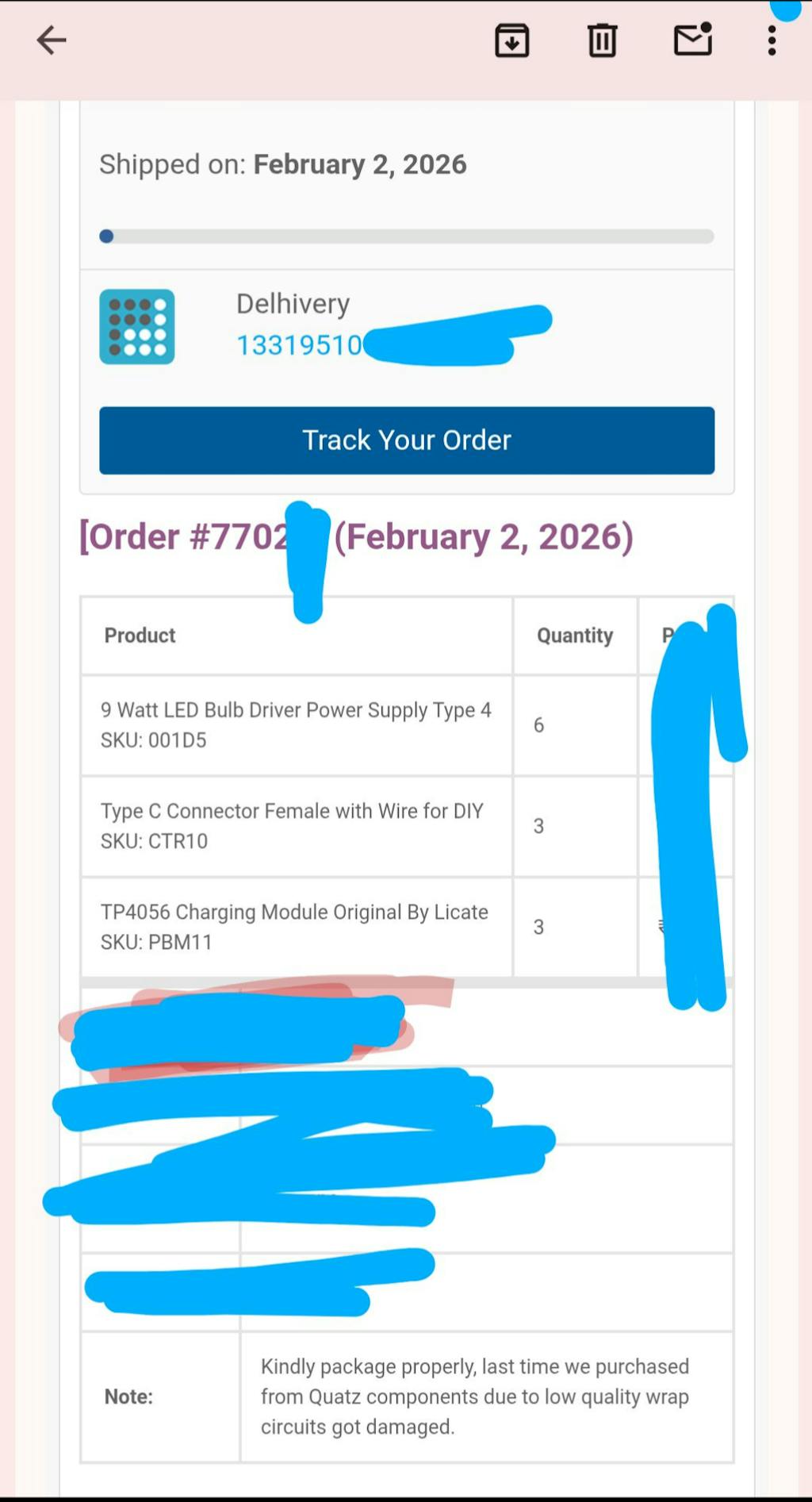 For any questions related to shipping, please contact our support team at support@quartzcomponents.com.