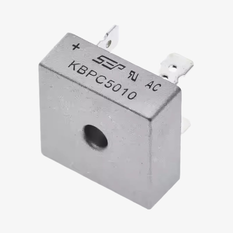 The KBPC5010 is a high-power 50A 1000V bridge rectifier designed for AC to DC conversion in high-current applications. It efficiently converts AC input into stable DC output, making it ideal for power supplies, motor drivers, industrial control systems, and battery charging circuits. The metal case design enhances heat dissipation, ensuring reliable and long-term performance.