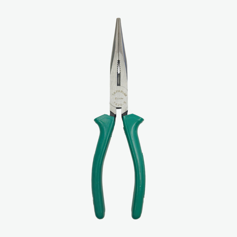 The Taparia Long Nose Plier 1420-8 (Econ) is a precision tool crafted from high-grade chrome vanadium steel. Its sharp, hardened cutting edges and ergonomic design make it ideal for cleanly cutting and handling wires with ease.