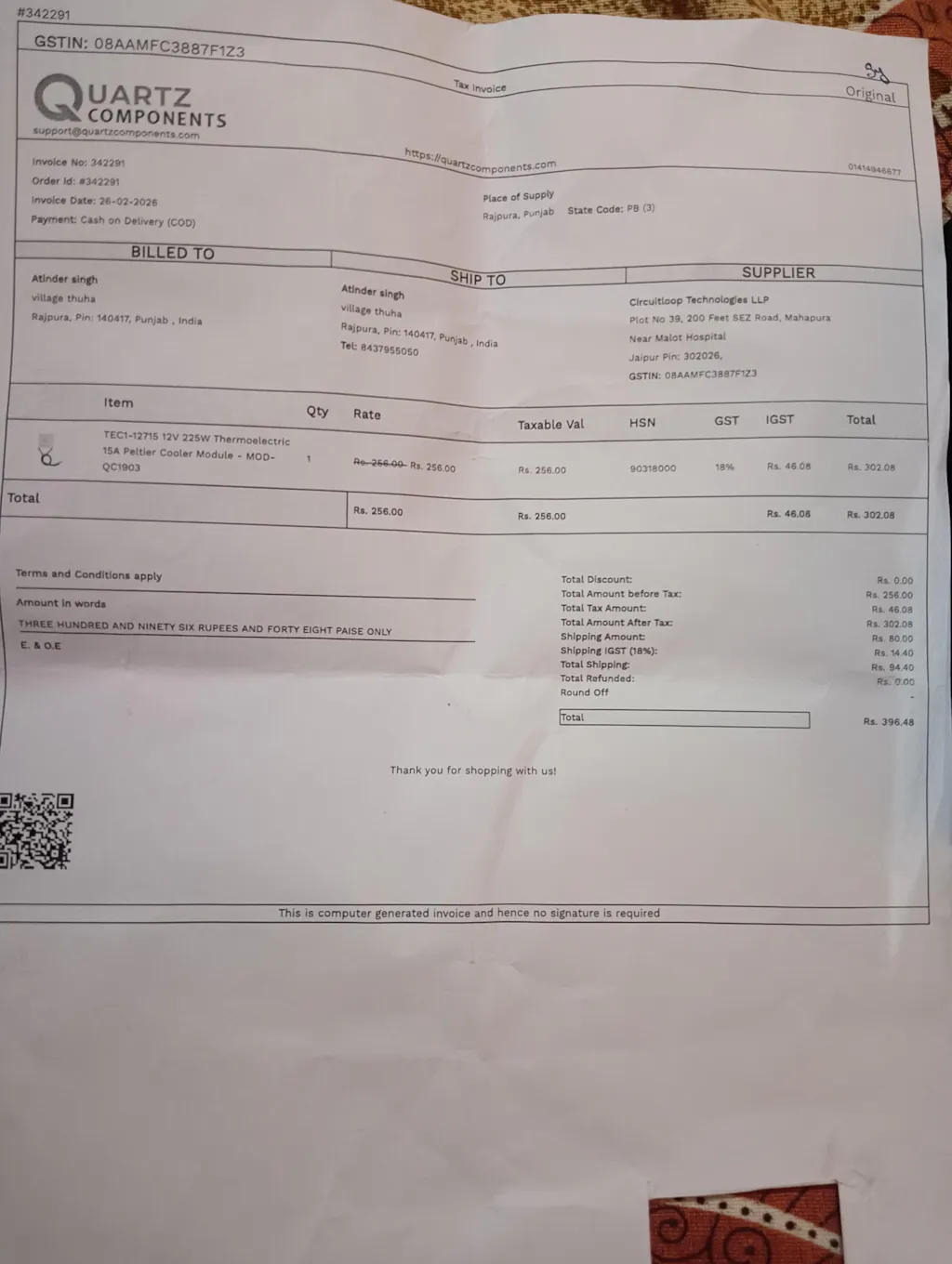 For any questions related to shipping, please contact our support team at support@quartzcomponents.com.